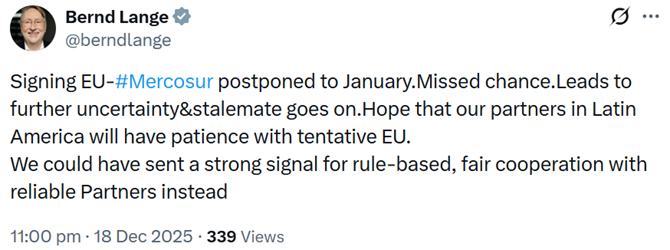 The revised timetable sets final discussions among European ambassadors for January 9, when they are expected to approve and sign both the EU-Mercosur trade deal and the accompanying farmers’ safeguard measures regulation. Only then can Commission President Ursula von der Leyen proceed to sign the agreement during her trip to Paraguay on January 12.